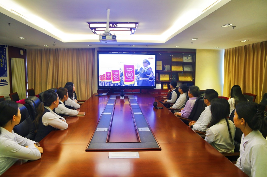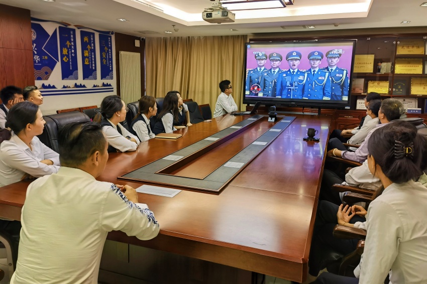 上午9时,机关员工们早早地来到了会议室,整齐地坐在会议桌前,怀着激动而崇敬的心情等待阅兵仪式的开始。当庄严的国歌响起,全体员工自发起立,面向大屏幕,行注目礼,那一刻,神情庄重而肃穆。